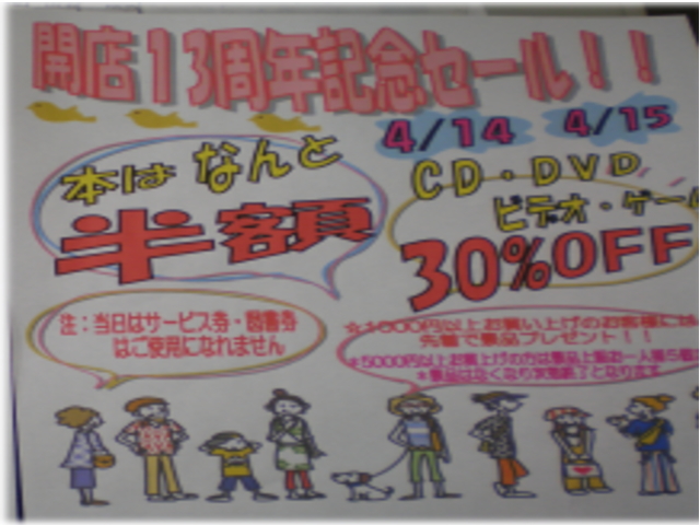 お疲れ様です 促進課のオヨヨです 上の写真をご覧ください4月14日・15日はBOOKOFF海老名店の13周年記念のイベント内容です なんと 本が半額 CD・DVD・ゲーム・ビデオ30%OFFの大感謝祭